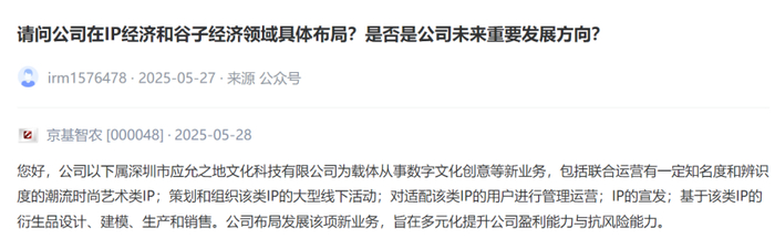 京基智农 [000048] :公司以下属深圳市应允之地文化科技有限公司为载体从事数字文化创意等新业务,包括联合运营有一定知名度和辨识度的潮流时尚艺术类IP;策划和组织该类IP的大型线下活动;对适配该类IP的用户进行管理运营;IP的宣发;基于该类IP的衍生品设计、建模、生产和销售。公司布局发展该项新业务,旨在多元化提升公司盈利能力与抗风险能力。