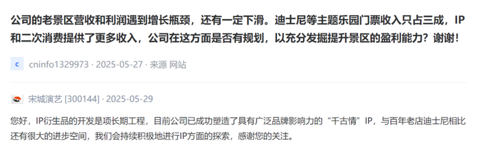 公司的老景区营收和利润遇到增长瓶颈,还有一定下滑。迪士尼等主题乐园门票收入只占三成,IP和二次消费提供了更多收入,公司在这方面是否有规划,以充分发掘提升景区的盈利能力?