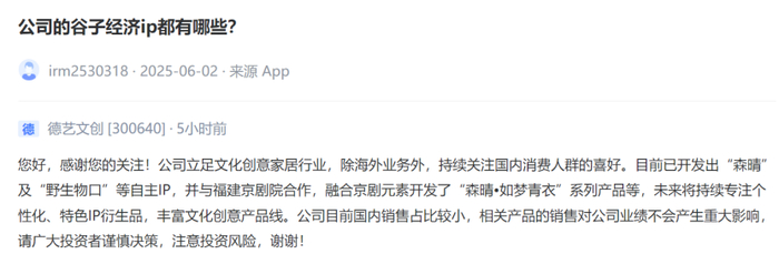 德艺文创 [300640] :公司立足文化创意家居行业,除海外业务外,持续关注国内消费人群的喜好。目前已开发出“森晴”及“野生物口”等自主IP,并与福建京剧院合作,融合京剧元素开发了“森晴•如梦青衣”系列产品等,未来将持续专注个性化、特色IP衍生品,丰富文化创意产品线。公司目前国内销售占比较小,相关产品的销售对公司业绩不会产生重大影响。
