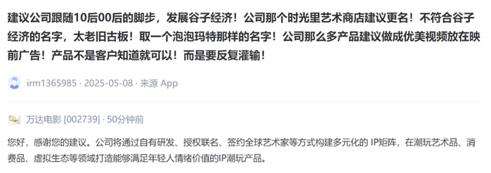万达电影 [002739] :公司将通过自有研发、授权联名、签约全球艺术家等方式构建多元化的 IP矩阵,在潮玩艺术品、消费品、虚拟生态等领域打造能够满足年轻人情绪价值的IP潮玩产品。