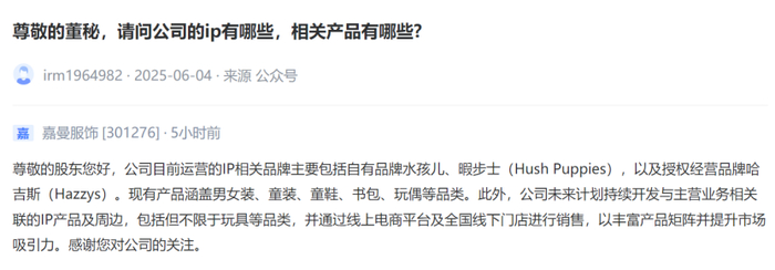 嘉曼服饰 [301276] :公司目前运营的IP相关品牌主要包括自有品牌水孩儿、暇步士(Hush Puppies),以及授权经营品牌哈吉斯(Hazzys)。现有产品涵盖男女装、童装、童鞋、书包、玩偶等品类。此外,公司未来计划持续开发与主营业务相关联的IP产品及周边,包括但不限于玩具等品类,并通过线上电商平台及全国线下门店进行销售,以丰富产品矩阵并提升市场吸引力。
