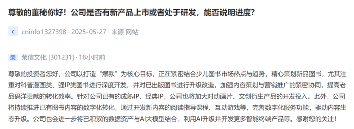 荣信文化 [301231] :公司以打造“爆款”为核心目标,正在紧密结合少儿图书市场热点与趋势,精心策划新品图书,尤其注重对科普漫画类、强IP类图书进行深度开发,并对已出版图书进行升级改造,加强内容策划与营销推广的紧密协同,提高老品码洋贡献的转化效率。针对公司已有的成熟IP、经典IP,公司也将加大对动画片、文创衍生产品的开发投入。此外,公司将持续推进已有图书内容的数字化转化,通过开发新内容的阅读指导课程、互动游戏等,完善数字化服务功能,驱动内容生态升级。公司也会进一步将已积累的数据资产与AI大模型结合,利用AI升级并开发更多智能终端产品等。