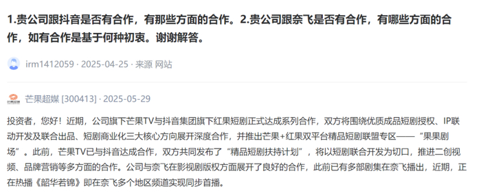 芒果超媒 [300413] :近期,公司旗下芒果TV与抖音集团旗下红果短剧正式达成系列合作,双方将围绕优质成品短剧授权、IP联动开发及联合出品、短剧商业化三大核心方向展开深度合作,并推出芒果+红果双平台精品短剧联盟专区——“果果剧场”。此前,芒果TV已与抖音达成合作,双方共同发布了“精品短剧扶持计划”,将以短剧联合开发为切口,推进二创视频、品牌营销等多方面的合作。
