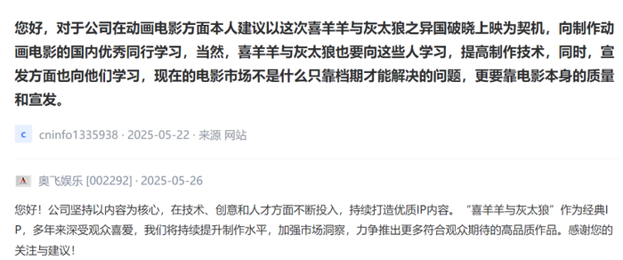 奥飞娱乐 [002292] :公司坚持以内容为核心,在技术、创意和人才方面不断投入,持续打造优质IP内容。“喜羊羊与灰太狼”作为经典IP,多年来深受观众喜爱,我们将持续提升制作水平,加强市场洞察,力争推出更多符合观众期待的高品质作品。