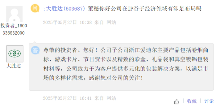 大胜达 [603687] :公司子公司浙江爱迪尔主要产品包括卷烟商标、游戏卡片、节日贺卡以及精致的彩盒、礼品袋和真空镀铝包装材料等,公司致力于为客户提供多元化的包装解决方案,以满足市场的多样化需求。