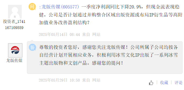 一季度净利润同比下降20.9%,但现金流表现稳健。公司是否计划通过并购整合区域出版资源或布局IP衍生品等高附加值业务改善盈利结构?