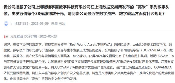 元隆雅图 [002878] :在数字经济的浪潮下,将现实世界资产(Real World Assets下称RWA)通过区块链、web3.0等技术以数字化、数据化、数字资产的形式进行价值储存、交易与生态发展正成为新的趋势。公司控股子公司喔哇宇宙(UOVAMETA)在IP数字化、数据化、资产化发行与营销运营方面具备一体化能力,获得2024年文昌链生态「杰出应用」奖项。近期UOVAMETA与江苏省文交所开展战略合作,共同推进科技部"数字文创资产权属管理及服务网络"重点研发项目的产业化应用。江苏省文交所作为省级文化产权交易平台,将为UOVAMETA提供数字文创资产合规监管、资产登记确权及流通服务;UOVAMETA依托元隆雅图集团,将注入丰富的数字文创资产及文创品资源,特别是文博类和文旅类数字资产,推动文化遗产的数字化活化,也将共同推进“高米”系列数字文创资产的发行。