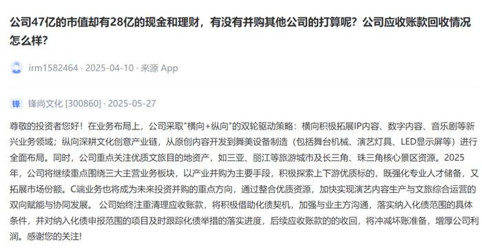 锋尚文化 [300860] :在业务布局上,公司采取"横向+纵向"的双轮驱动策略:横向积极拓展IP内容、数字内容、音乐剧等新兴业务领域;纵向深耕文化创意产业链,从原创内容开发到舞美设备制造(包括舞台机械、演艺灯具、LED显示屏等)进行全面布局。同时,公司重点关注优质文旅目的地资产,如三亚、丽江等旅游城市及长三角、珠三角核心景区资源。2025年,公司将继续重点围绕三大主营业务板块,以产业并购为主要手段,积极探索上下游优质标的,既强化专业人才储备,又拓展市场份额。C端业务也将成为未来投资并购的重点方向,通过整合优质资源,加快实现演艺内容生产与文旅综合运营的双向赋能与协同发展。 公司始终注重清理应收账款,将积极借助化债契机,加强与业主方沟通,落实纳入化债范围的具体条件,并对纳入化债申报范围的项目及时跟踪化债举措的落实进度,后续应收账款的的收回,将冲减坏账准备,增厚公司利润。