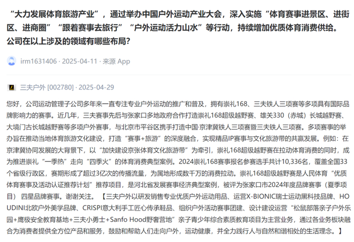 三夫户外 [002780] :公司运动管理子公司多年来一直专注专业户外运动的推广和普及,拥有崇礼168、三夫铁人三项赛等多项具有国际品牌影响力的赛事。近几年,三夫赛事先后与张家口多地政府合作打造崇礼168超级越野赛、雄关330(赤城)长城越野赛、大境门古长城越野赛等多项户外赛事,与北京市平谷区携手打造中国·京津冀铁人三项赛暨三夫铁人三项赛。多项赛事的举办旨在推动当地体育旅游文化建设,打造“赛事+旅游”的深度融合,实现精品IP赛事与文化旅游带的共赢发展。