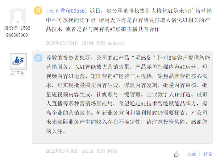 天下秀 [600556] :公司的AI产品“灵感岛”针对B端客户提供智能营销服务,以AI智能放大营销效果,产品涵盖社媒内容AI运营、短视频内容AI运营、矩阵营销AI运营三大板块,聚焦品牌营销核心需求,可实现批量图文内容生成、爆款内容复刻、批量内容审核、批量短视频内容生成、社媒账号一键管理、企业数字人IP打造、虚拟人直播等多种营销场景应用,希望通过AI技术智能赋能品牌方,提高企业的营销效率。创新业务方向和盈利模式仍需要探索,对公司未来实际业务产生的收入存在不确定性,请注意投资风险。