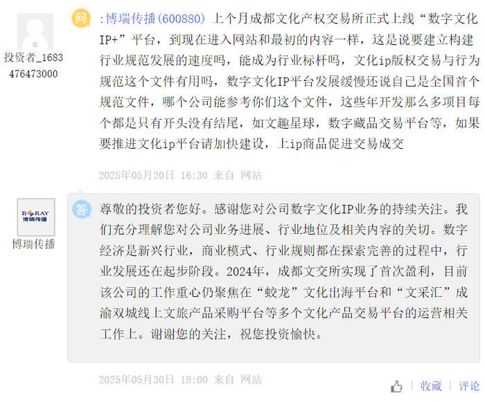 博瑞传播 [600880] :我们充分理解您对公司业务进展、行业地位及相关内容的关切。数字经济是新兴行业,商业模式、行业规则都在探索完善的过程中,行业发展还在起步阶段。2024年,成都文交所实现了首次盈利,目前该公司的工作重心仍聚焦在“蛟龙”文化出海平台和“文采汇”成渝双城线上文旅产品采购平台等多个文化产品交易平台的运营相关工作上。