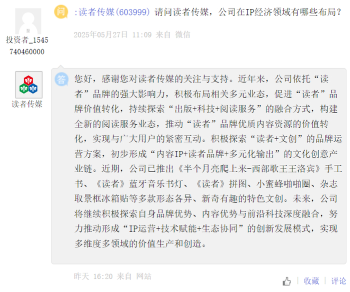 读者传媒 [603999] :近年来,公司依托“读者”品牌的强大影响力,积极布局相关多元业态,促进“读者”品牌价值转化,持续探索“出版+科技+阅读服务”的融合方式,构建全新的阅读服务业态,推动“读者”品牌优质内容资源的价值转化,实现与广大用户的紧密互动。积极探索“读者+文创”的品牌运营方案,初步形成“内容IP+读者品牌+多元化输出”的文化创意产业链。近期,公司已推出《半个月亮爬上来-西部歌王王洛宾》手工书、《读者》蓝牙音乐书灯、《读者》拼图、小蜜蜂啪啪圈、杂志取景框冰箱贴等多款形态各异、新奇有趣的特色文创。未来,公司将继续积极探索自身品牌优势、内容优势与前沿科技深度融合,努力推动形成“IP运营+技术赋能+生态协同”的创新发展模式,实现多维度多领域的价值生产和创造。