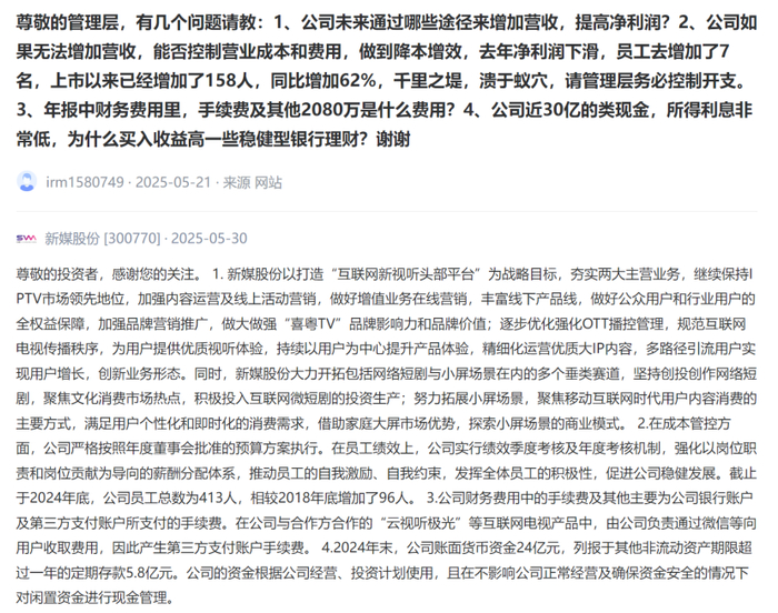 新媒股份 [300770] :新媒股份以打造“互联网新视听头部平台”为战略目标,夯实两大主营业务,继续保持IPTV市场领先地位,加强内容运营及线上活动营销,做好增值业务在线营销,丰富线下产品线,做好公众用户和行业用户的全权益保障,加强品牌营销推广,做大做强“喜粤TV”品牌影响力和品牌价值;逐步优化强化OTT播控管理,规范互联网电视传播秩序,为用户提供优质视听体验,持续以用户为中心提升产品体验,精细化运营优质大IP内容,多路径引流用户实现用户增长,创新业务形态。同时,新媒股份大力开拓包括网络短剧与小屏场景在内的多个垂类赛道,坚持创投创作网络短剧,聚焦文化消费市场热点,积极投入互联网微短剧的投资生产;努力拓展小屏场景,聚焦移动互联网时代用户内容消费的主要方式,满足用户个性化和即时化的消费需求,借助家庭大屏市场优势,探索小屏场景的商业模式。