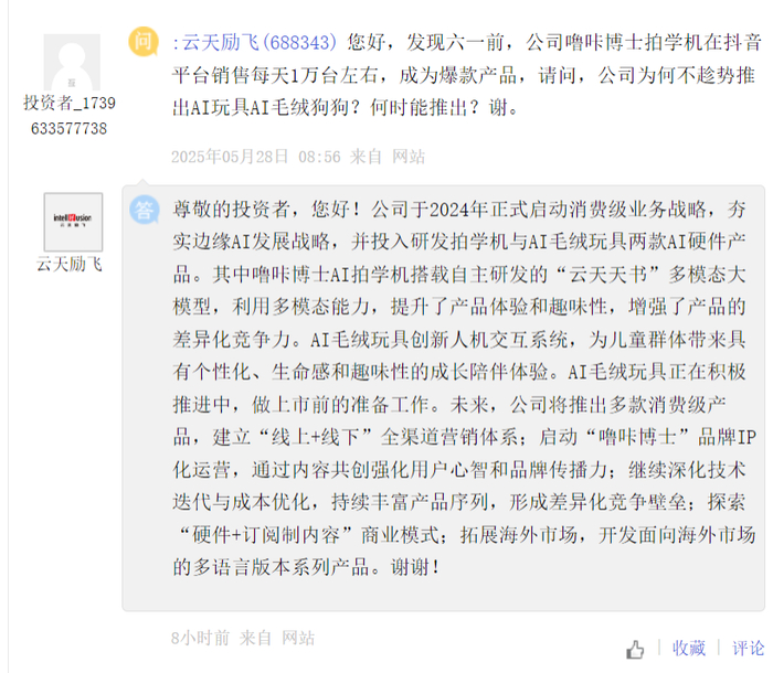 发现六一前,公司噜咔博士拍学机在抖音平台销售每天1万台左右,成为爆款产品,请问,公司为何不趁势推出AI玩具AI毛绒狗狗?何时能推出?