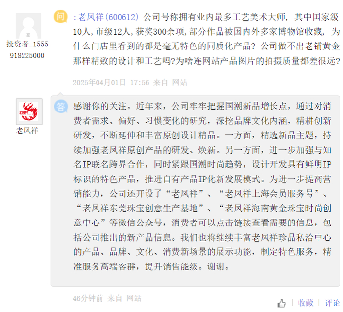 公司号称拥有业内最多工艺美术大师, 其中国家级10人,市级12人,获奖300余项,部分作品被国内外多家博物馆收藏, 为什么门店里看到的都是毫无特色的同质化产品? 公司做不出老铺黄金那样精致的设计和工艺吗?为啥连网站产品图片的拍摄质量都差很远?