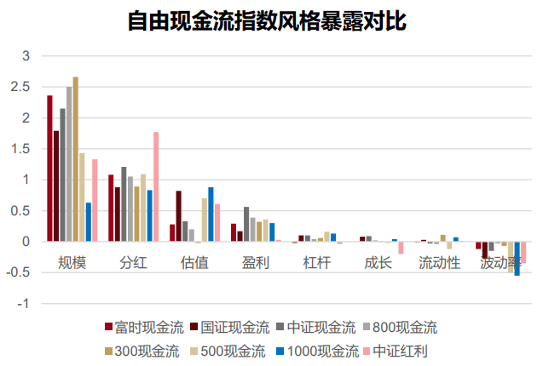 我们看行业的分布,比较相像的是800现金流,都是石油石化、煤炭相对多一些,这里我们就不展开说了。下面这个图是不同指数在不同风格上的暴露,首先我们不是通过特别多的风格暴露来赚取超额收益,这点是我要始终强调的。富时现金流、国证现金流、中证现金流的收益表现都是第一梯队,但是在规模上的暴露程度都不是那么多,我们在规模上会比较多一些,因为我们本身是偏大中市值的,中证和国证在规模的暴露度上也不是那么高,并且分红风格的暴露都没有中证红利高,其他风格也是。我始终强调,现金流不是通过在某些风格上有特别暴露去获取超额收益,它本身就是超额收益的一个来源。