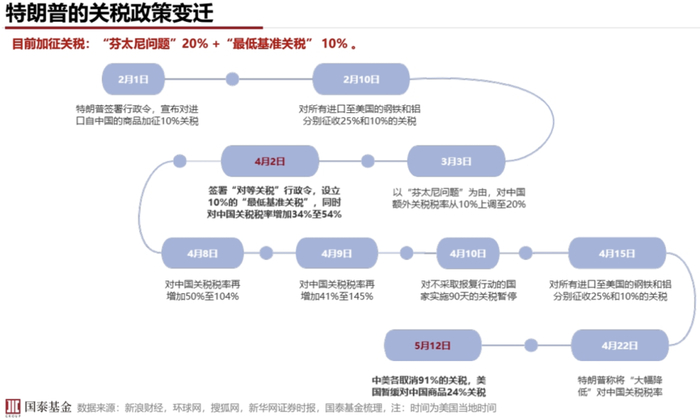 先来回顾一下关税的变化情况。特朗普的关税政策是有一个变化过程的,最早是2018年他刚上任总统的时候就对中国加征过关税,再到现在尤其是4月2日,他对全球很多合作伙伴都签署了对等关税行政令,实施了最低10%的基准关税,而对中国当时是从34%增加到了54%。中间又经过了一系列的曲折,到5月12日中美进行了关税谈判,各取消了90%的关税,并且美国也暂缓了对中国商品24%的对等关税,这是超出预期的。