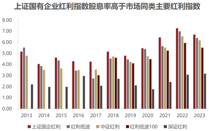 说完科技了就进入到红利的部分,我们有一个品种是挺有意思的,它叫红利国企ETF(510720)。下边是当前截面的数据,它的股息率几乎是所有红利指数里边最高的,还有持续的数据,从历史的年份来看,除了2013年,后面基本上每年它的股息率都高过其他的红利指数,2024年和2025年到现在也是赢的。这是红利国企ETF(510720)的数据,大家可以看一下。