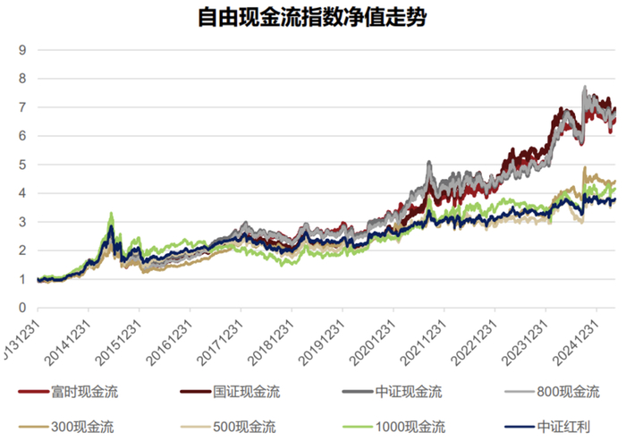 分年度收益我们给大家看一下,我们会非常明显地发现富时指数、国证、中证和800现金流整体表现都还是不错的,表现一般的有300现金流、500现金流、1000现金流,这三个是第二梯队,跟红利表现差不了太多。
