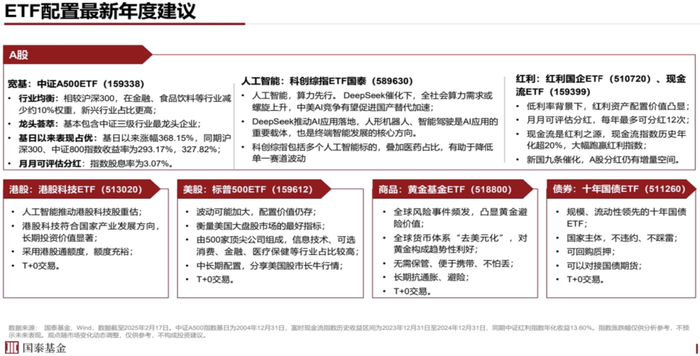 如果要说现在的建议和之前有什么变化?其实也没有太大的变化,总体的思路还是一样的,但是我们会把人工智能的标的做一些调整,原来是上游的半导体设备ETF(159516),现在我们就建议调整成科创综指ETF国泰(589630)。还有红利我们也做了升级,是红利国企ETF(510720)加现金流ETF(159399),其他资产方面,我们还是建议都配置。港股可以配港股科技ETF(513020)、美股可以配标普500ETF(159612)、商品可以配黄金基金ETF(518800)。债券方面,我们把债券调整成了十年国债ETF(511260),年初的时候收益率下的特别快,所以我们就放了一个短久期的国债ETF(511010),但现在债市有所调整,所以我们觉得十年国债ETF(511260)还是更均衡,配置价值要更强一些。
