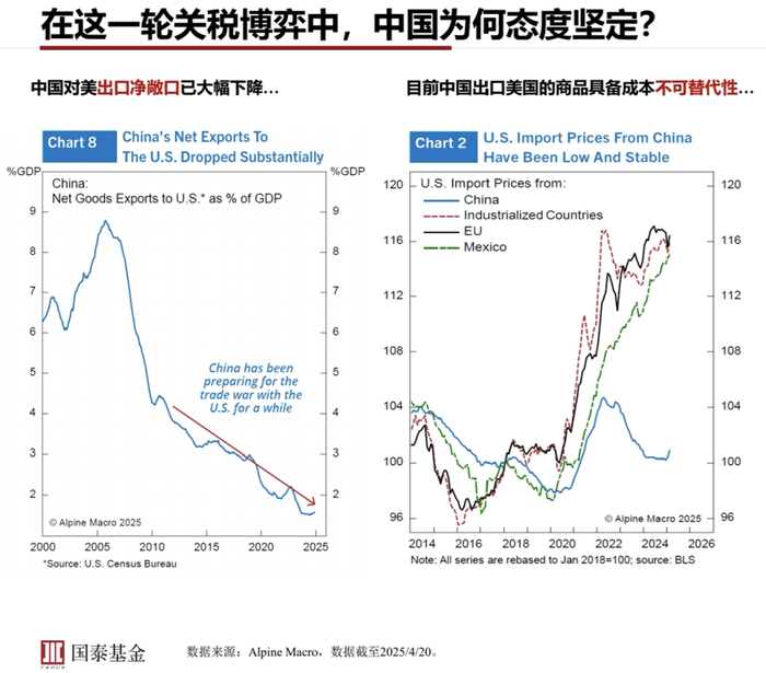 但是到五六月份,中美关税的进展应该是放缓了。为什么我们会这么判断?我们也有一些依据。我们能感受到在这一轮关税冲击中,中国政府特别有定力,这份定力或者背后的底气来自于哪里?我们分享一些数据,其一是这些年,尤其是2018年以后中国对美出口的净敞口是不断下降的,我们出口到美国商品总额在出口总量里的占比是不断下降的。