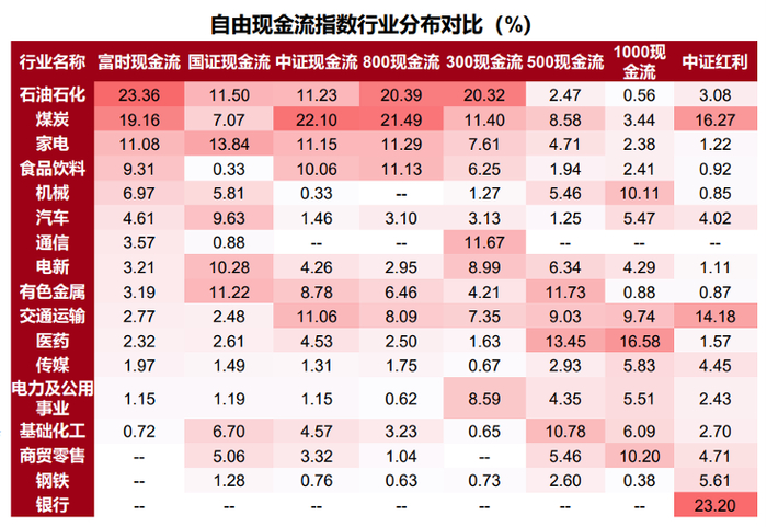 市场上现在有一大堆现金流指数,总有人问我它们有什么区别?所以我们就做了一些比较。自由现金流有一个大的前提,它们会把金融、地产行业先剔掉。为什么剔除呢?因为对于金融行业来说,现金就是生产资料,所以一般我们不拿金融行业直接去跟其他行业的自由现金流做对比。而地产行业的现金流波动太大,它拿地的时候现金流紧的要命,到开始销售房子的时候就开始回款,现金流瞬间就上去了。我们经常说去掉一个最高分,去掉一个最低分,地产很容易成为最高分和最低分,所以我们就不要了,这两个行业就剔除掉了。
