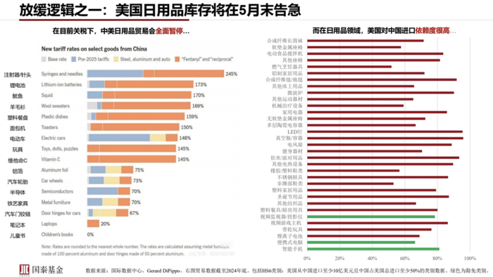 我们再来看一下具体的放缓判断的逻辑有哪些?第一个是美国日用品的库存在5月底可能就要告急了。这个事情在5月12号之前我们也是这么判断的,只不过5月12号谈判最终兑现了。中国市场供给到全世界范围的商品价格和其他经济体相比确实是便宜一大截儿,我们现在在美国日用品供应上占比在60%到80%,量确实是非常的大。
