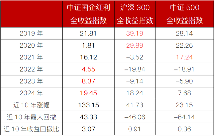 全收益由考虑了所有股票分红再投资所产生的收益计算得出。数据来源:Wind,近10年区间:2014.12.31至2024.12.31。最大回撤表示在特定时间段内,从最高点跌至最低点的最大幅度。收益回撤比=区间累计收益/区间最大回撤的绝对值。指数的历史数据不代表未来表现,也不代表具体基金的业绩表现。指数的展示主要是为了有效地表达特定市场或者策略的走势,不构成任何基金或交易策略的依据或建议,且指数运作时间较短,不能反映市场发展的所有阶段。中证国企红利全收益指数与沪深300全收益、中证500全收益等主流宽基指数在成份券构成、筛选规则等方面存在不同,涨跌幅不具有可比性,仅供参考。