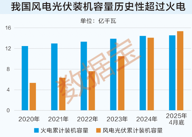 数据显示,我国风电光伏装机容量于今年2月即完成对火电的超越。截至2025年2月底,我国风电光伏合计装机量达到14.56亿千瓦,超过火电的14.48亿千瓦。回溯历史发现,在“十三五”末的2020年,我国风电光伏合计装机容量仅为5.35亿千瓦,不到火电(当时为12.45亿千瓦)的一半,在“十四五”期间累计增幅超过186%。
