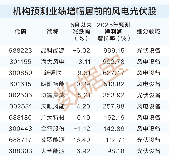 2023年以来,随着行业产能集中爆发,产业链价格进入回调周期,风电光伏企业利润出现下滑,部分光伏设备企业出现了一定的亏损。多家机构认为,进入2025年,行业通过自律已实现库存良性周转,有望迎来盈利修复。根据5家及以上机构一致预测,上述121股中,有48股机构预测2025年净利润有望实现增长或扭亏,其中晶科能源、海力风电、新强联预测增幅居前,分别为999.15%、992.78%、627.47%。