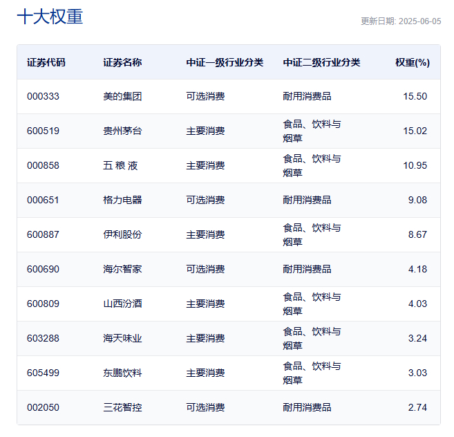 以中证消费50指数为例,成分股大部分给了美的、茅台、五粮液这些老牌白酒、饮料、家电公司。