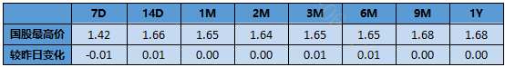 今今日同业存单尚可,长端收益率下行。一级发行需求不错,9M和1Y大行发在1.63%-1.64%和1.63%。一级发行带动二级收益率下行。全日分期看国股存单,6月到期1.50;9月底到期1.605;12月底到期1.62;3月底到期1.64;6月到期1.64。