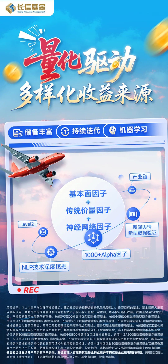 风险提示:以上内容不作为任何投资建议,建议投资者选择符合自身风险承受能力、投资目标的基金。基金管理人承诺以诚实信用、勤勉尽责的原则管理和运用基金资产,但不保证基金一定盈利,也不保证最低收益。我国基金运作时间较短,不能反映股市发展的所有阶段。长信沪深300指数增强型证券投资基金、长信中证500指数增强型证券投资基金、长信中证A500指数增强型证券投资基金、长信中证1000指数增强型证券投资基金、长信中证科创创业50指数增强型证券投资基金为股票型基金,预期风险和预期收益均高于混合型基金、债券型基金和货币市场基金。长信国防军工量化灵活配置混合型证券投资基金为混合型基金,其预期风险和预期收益低于股票型基金,高于债券型基金和货币市场基金。长信沪深300指数增强型证券投资基金、长信中证500指数增强型证券投资基金、长信中证A500指数增强型证券投资基金、长信中证1000指数增强型证券投资基金、长信中证科创创业50指数增强型证券投资基金为指数型基金,具有与标的指数以及标的指数所代表的股票市场相似的风险收益特征。长信中证科创创业50指数增强型证券投资基金若投资香港联合交易所上市的股票,将面临港股通机制下因投资环境、投资标的、市场制度以及交易规则等差异带来的特有风险。您应当充分了解基金定期定额投资和零存整取等储蓄方式的区别。定期定额投资是引导投资者进行长期投资、平均投资成本的一种简单易行的投资方式,但并不能规避基金投资所固有的风险,不能保证投资者获得收益,也不是替代储蓄的等效理财方式。基金的过往业绩并不预示其未来表现,基金管理人管理的其他基金的业绩并不构成基金业绩表现的保证。请在购买前认真阅读《基金合同》、《招募说明书》等基金法律文件。基金有风险,投资须谨慎。