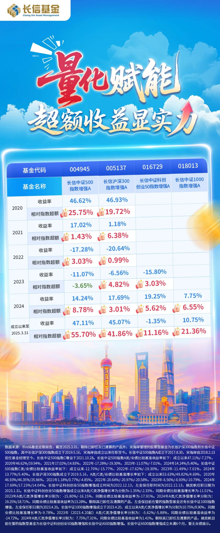 在2024年的震荡行情中,长信沪深300指数增强基金A以17.69%的收益(同期业绩比较基准收益14.04%)跑赢沪深300指数3.01%,且连续5个自然年度收益率优于同期沪深300指数表现;长信中证500指数增强基金A相对中证500指数超额收益8.78%(同期业绩比较基准收益5.40%),成立以来相对指数超额收益达55.70%(同期业绩比较基准收益-7.27%)。