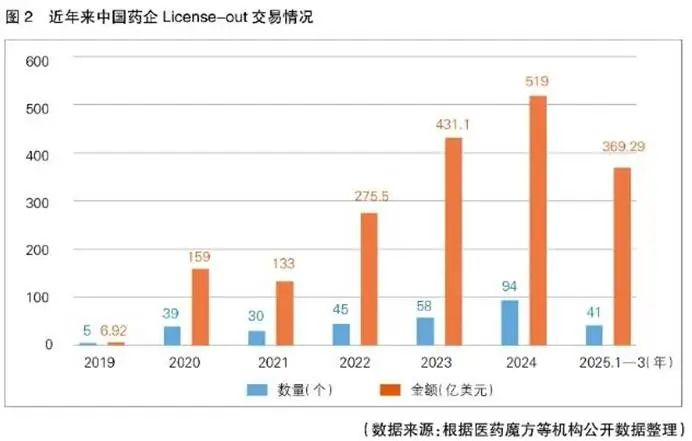 根据医药魔方数据显示,2024年中国创新药对外授权交易(License-out)完成94笔,出海交易总金额高达519亿美元,同比增长26%。进入2025年,一季度中国创新药资产仍旧热度爆棚。