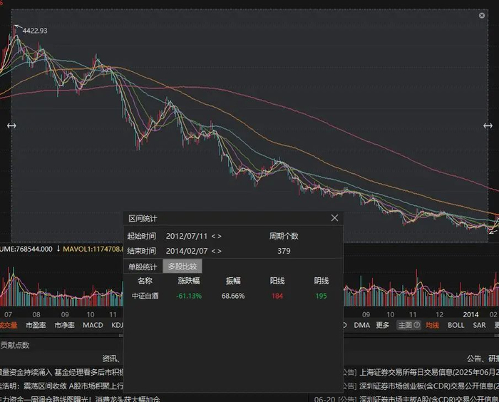 从历史数据来看,在2012年7月11日到2014年2月7日这个区间里,中证白酒指数跌幅超过了61%!