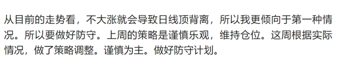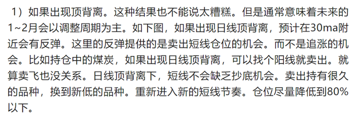 实际本周确实形成了日线顶背离,是先反弹然后跌才形成,因此虽我也按上周报文章说的,卖出了煤炭,降低了仓位。但卖出价就没那么好。实际我还可以继续卖出解套的酒,这样仓位就可以降低到80%以下。