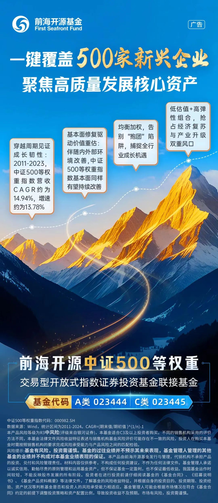 在政策暖风频吹、经济转型升级的背景下,中小盘企业有望迎来更多发展机遇,中证500等权重指数凭借其均衡配置、中小盘成长属性和自动再平衡机制,更具投资韧性,对于缺乏个股研究能力的普通投资者而言,不妨借助前海开源中证500等权ETF联接,一键高效布局中小盘成长机遇。