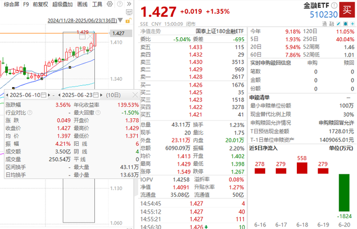 今日,金融ETF(510230)上涨1.35%位居市场前列,近5日上涨1.93%,近10日上涨3.56%,核心推动力在于银行板块。