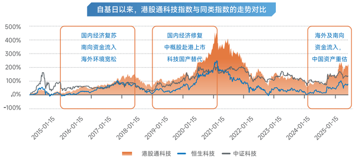 长期跑得赢,牛市有爆发性。自2015年以来,科技板块共出现过三轮大的上涨行情,港股通科技指数的上行弹性强、超额收益高,亦显著胜过中证科技、恒生科技指数。