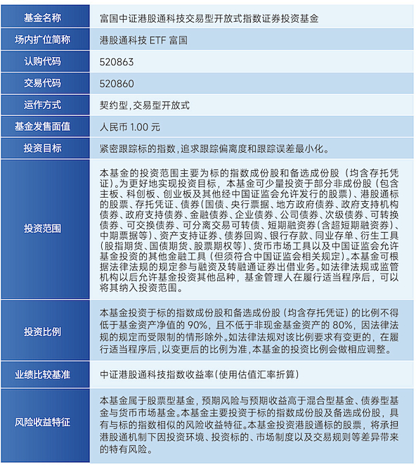 富国中证港股通科技交易型开放式指数证券投资基金(场内扩位简称:港股通科技ETF富国;认购代码:520863;交易代码:520860)紧密跟踪中证港股通科技指数(指数代码:931573.CSI),主要覆盖香港市场中的互联网、智能汽车、创新药企业,集港股三大核心资产于一身,符合“新质生产力”发展浪潮。受益于政策支持、外资回流等利好因素,港股科技板块的重估机遇或已到来,港股通科技ETF富国或为配置优选。