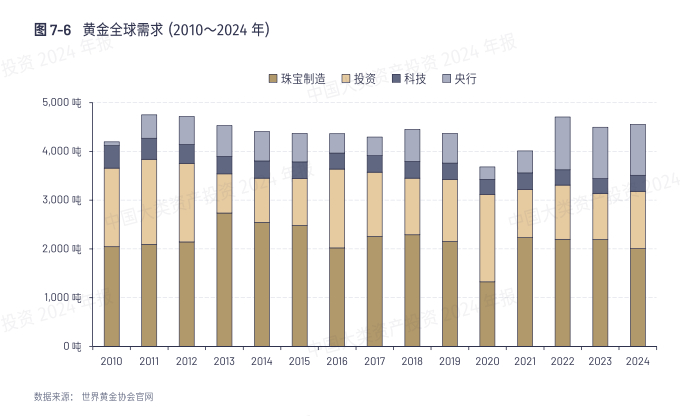 在政治动荡或战争时期,法定货币可能价值不在,而黄金作为贵金属和硬通货,其价值全球认可。比如 2022年俄乌冲突期间,俄罗斯央行储备的美元资产被冻结,而其存在央行金库的黄金储备则可以自由使用,凸显了黄金在危机中的重要性。近年来,政治局势的不稳定性增加,各国央行大幅增加了黄金的购买量,图7-6显示,过去三年,黄金作为储备资产的用途大幅增长。