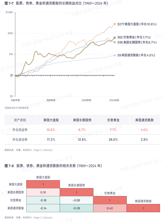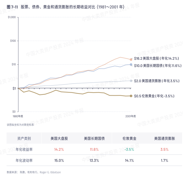 当纸币购买力稳定且市场对纸币信心充足时,黄金的收益率通常会大幅低于股票和债券,和通货膨胀基本持平。