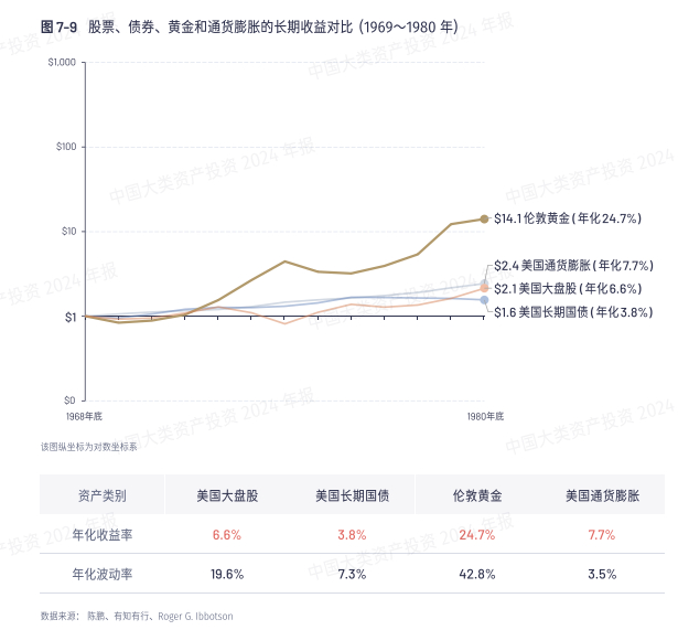 比如,1969-1980年的,受益于高通胀、高地缘风险下的黄金崛起,11年时间黄金年化收益达到24.7%;