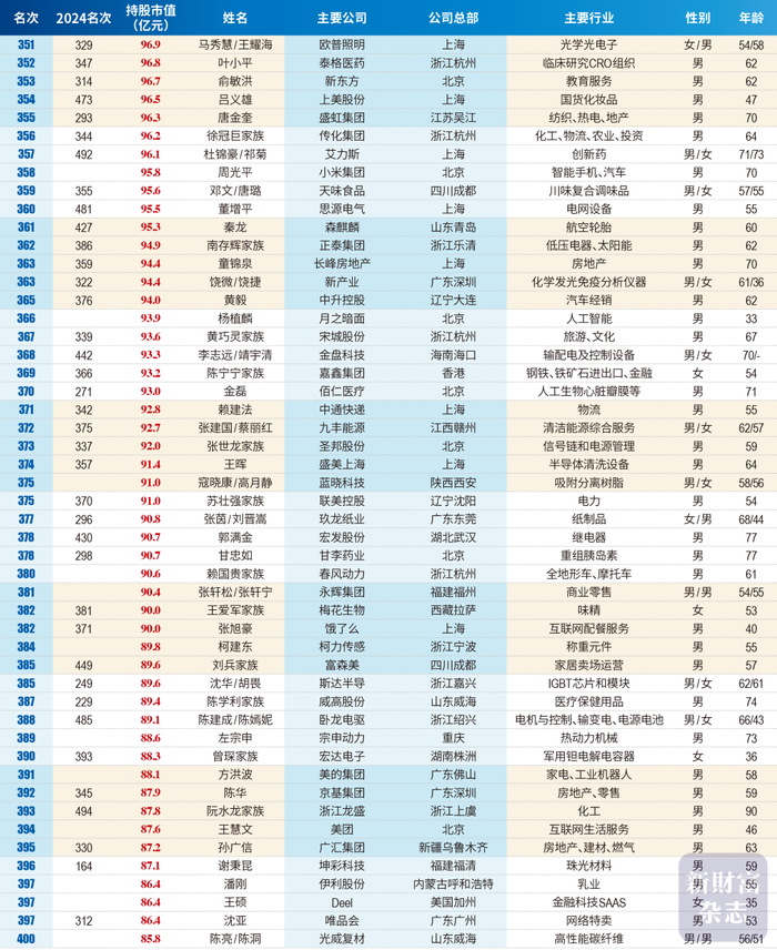 2024年,同花顺将近三成营收投入研发,且重点投向大模型、算力及高端人才引进,形成全场景AI产品矩阵,年末其市值突破1500亿元,为榜单贡献了4位富人。其创始人易峥以558亿元身家跻身第56名,高管叶琼玖、王进、于浩渺也分别以231亿、107亿、77亿元身家上榜,后两者也是多年来首次上榜。