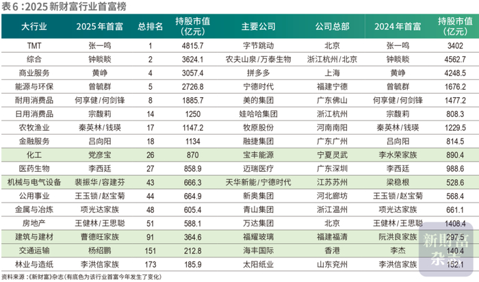 能否号准时代脉动,切中时代红利,是企业家登顶行业首富需修炼的头道内功。2025年,17个大行业中,13位行业首富成功卫冕,还有4个行业首富发生更迭。除了上述提及的机械与电气设备、建筑建材、交通运输行业外,化工业首富也发生了变动。不同地区带来的资源禀赋,及面对未来的战略抉择,是企业家财富分野的关键。