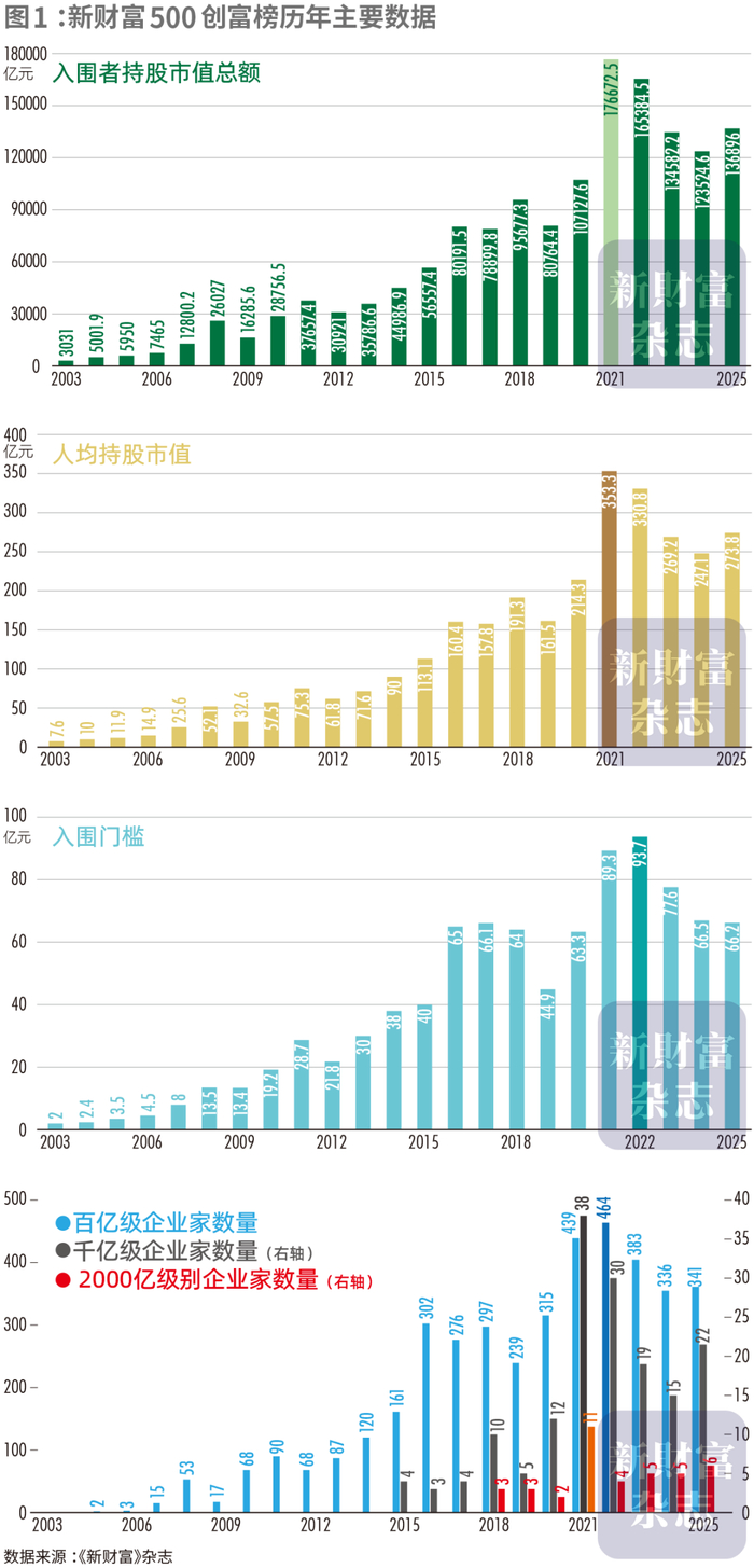 今年上榜的500位企业家(或家族)总持股市值为13.7万亿元,平均持股市值为273.8亿元,上榜门槛为66.2亿元,持股市值百亿以上的企业家为341位(图1)。