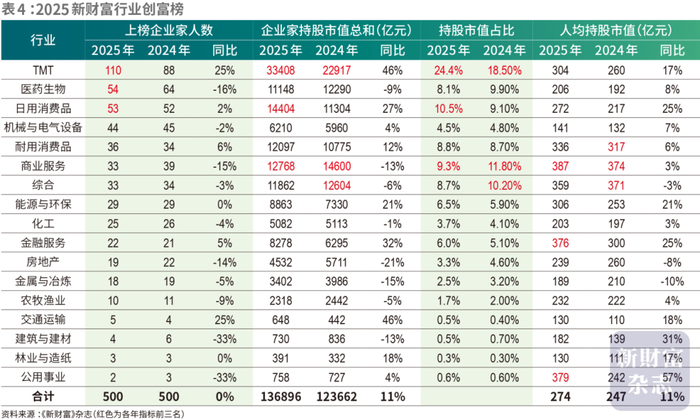 2025年,按行业统计企业家上榜人数,依然是TMT、医药生物、日用消费品占据创富前三赛道(表4)。