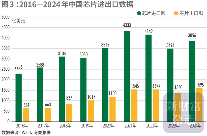 芯片是TMT赛道本轮主要创富池子,外部的围追堵截,倒逼出了最强的国产化信念,业绩放量、估值提升,成为芯片产业价值重估的地基。2024年,中国进口金额类别排第一的芯片,开始反向“卖爆”全球,出口量达到2981亿颗,出口金额达到1595亿美元(约合人民币1.16万亿元),不仅首次突破1万亿元大关,且成为出口额最高的单一商品,超越了服装、纺织品和手机等传统出口强项(图3)。
