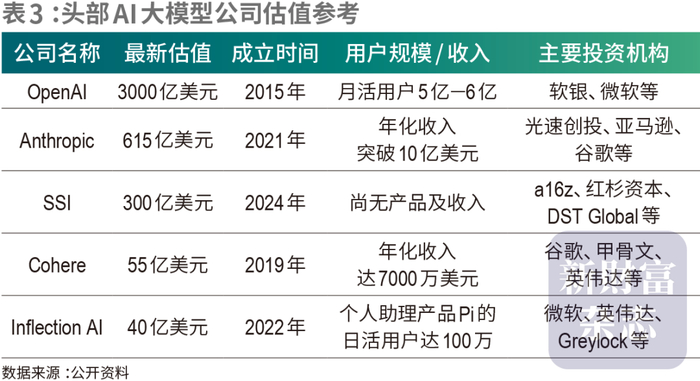 对比海外AI大模型的最新估值来看,OpenAI刚完成新一轮400亿美元融资,融后估值达到3000亿美元。由OpenAI前首席科学家伊尔亚·苏茨克维(Ilya Sutskever)2024年创办的Safe Superintelligence(SSI),团队成员不足20人,最新估值达300亿美元。推出Claude聊天机器人的Anthropic,刚完成35亿美元的E轮融资,最新估值615亿美元。